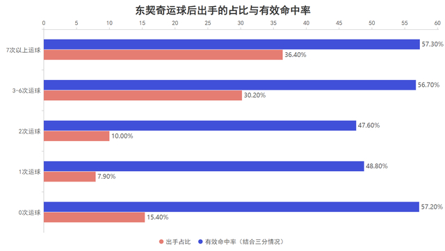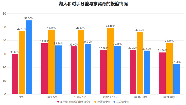 本赛季在湖人与对手分差1-5分与6-10分时,东契奇无论是使用率还是两项命中率都是相对更高的水准,这意味着当湖人与对手分差较近时东契奇消耗了更多的出手机会并且还有更高的得分效率,随着分差更大他的出手较少并且也更加随意,因此他的实际赛场表现还要优于目前的场均数据,这也得益于他的进攻风格。