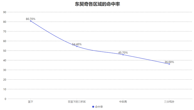 东契奇本赛季在篮下的命中率达到了夸张的80.7%,而其他的各个区域虽然没有篮下如此夸张但也都是优秀与合格水准,这意味着在整个进攻端东契奇没有明显的进攻死角,他在各个区域都有联盟中上游以上的得分效率。