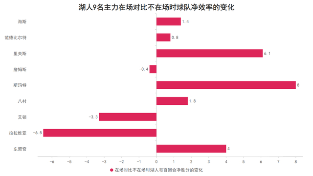 并且东契奇的问题还不止于此,他还经常被对手过掉后影响整体的防守质量,这也令东契奇在场时令湖人每百回合的失分数增多了3.1分。但即使如此东契奇进攻端的正面贡献也远大于防守端负面作用,东契奇的在场令湖人每百回合的净胜分提升了4分,这个净效率也位于湖人9名主力中的第三高,即使缺陷明显他也依然配得上湖人基石的角色。