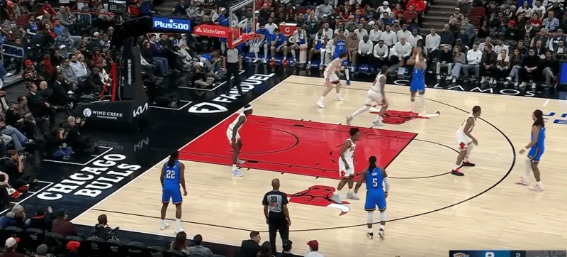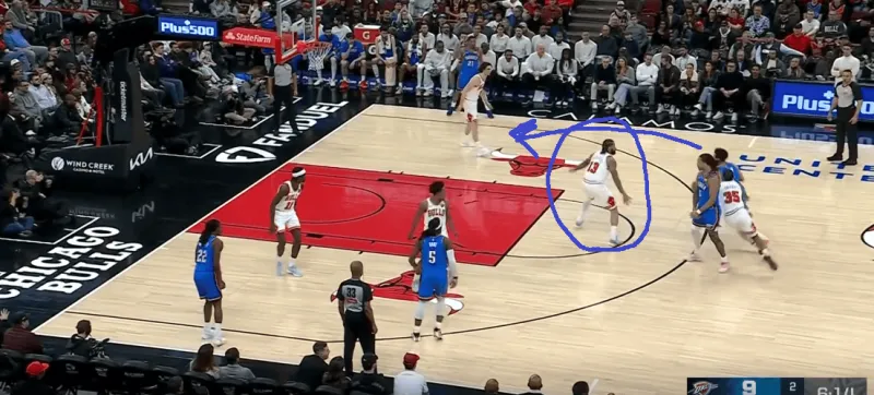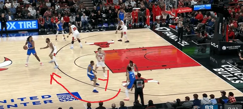 杰林-威廉姆斯弧顶策应时,麦凯恩跑动手递手迅速制造公牛的换防: