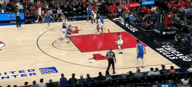 同样的战术发起下,麦凯恩的随机应变能力则让战术更加多变,正常来说借维金斯的掩护后要来到弧顶手递手,但麦凯恩利用吉迪和理查兹过去靠外的站位选择直接卷切: